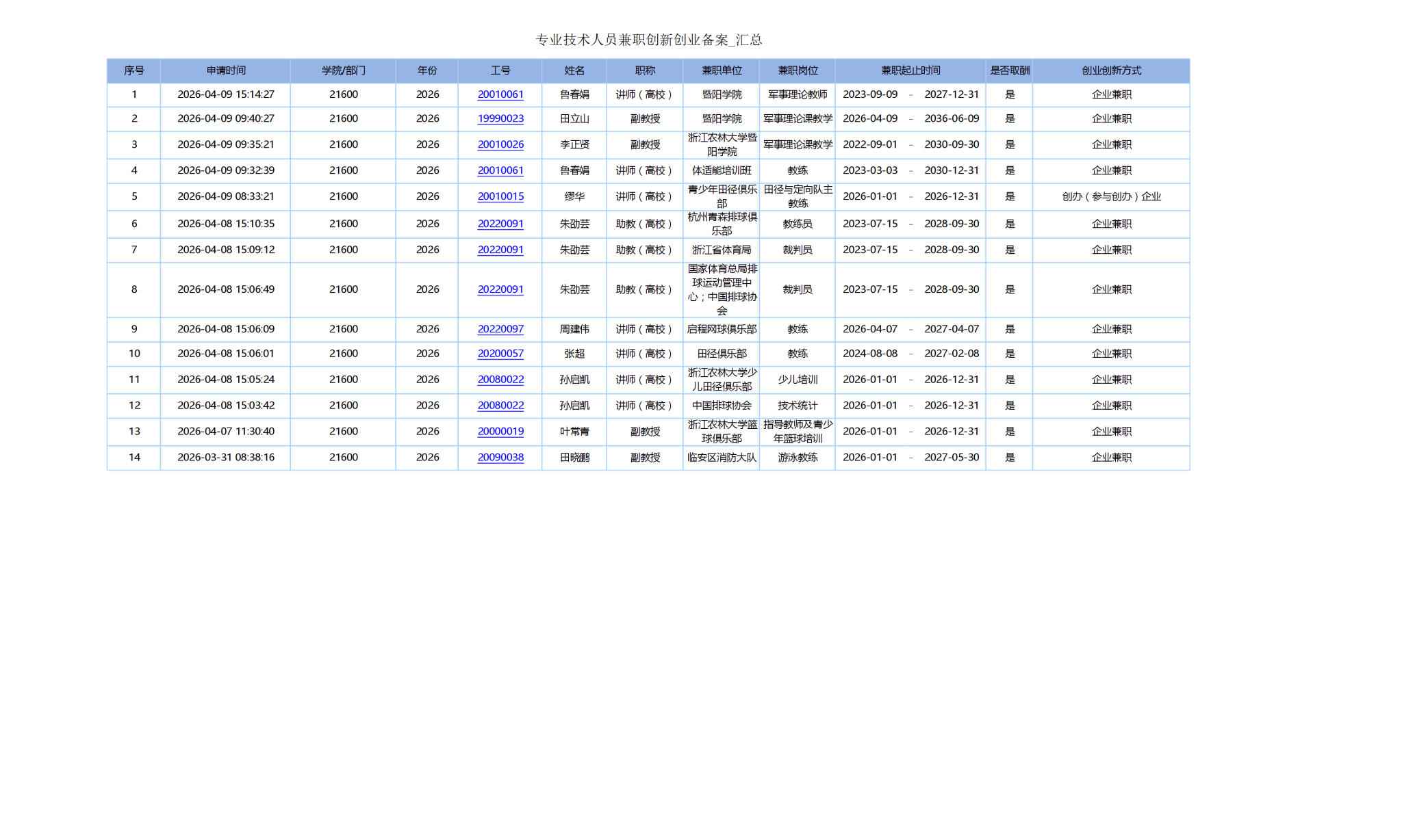 根据《浙江农林大学专业技术人员兼职创新创业管理办法(试行)》浙农林大(2025)19号要求,经个人提出申请,体军部领导班子集体研究决定,同意鲁春娟等10人专业技术人员兼职创新创业。现将名单予以公示,公示期自2026年4月14日至206年4月16日。如有问题,请于公示期内向体育军训部办公室 反映,联系电话:0571-63740265,邮箱:ybecky@126.com。